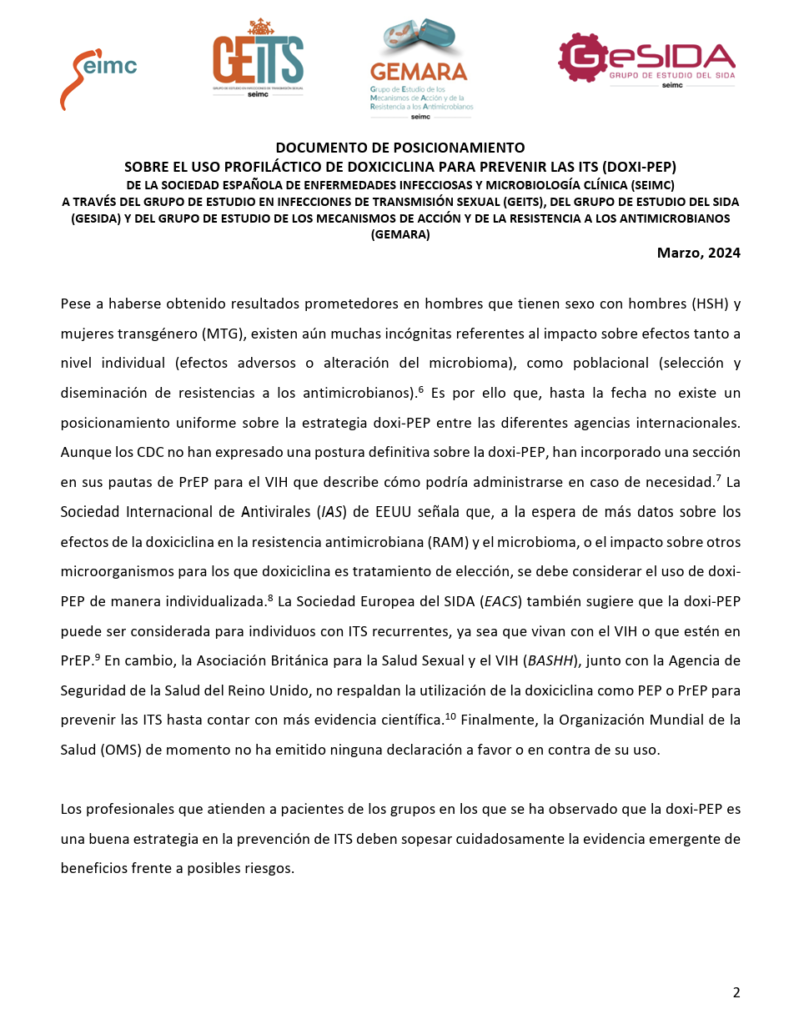 - El documento de posicionamiento de la SEIMC, elaborado por los grupos GEITS, GeSIDA y GEMARA (marzo 2024), revisa la evidencia científica disponible sobre el uso de doxiciclina como profilaxis postexposición (doxi-PEP) para prevenir infecciones de transmisión sexual bacterianas